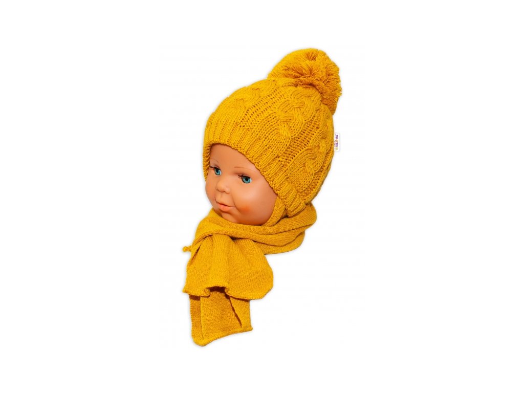 BABY NELLYS Zimná pletená čiapočka s šálom Baby Bear - horčicová s brmbolcami