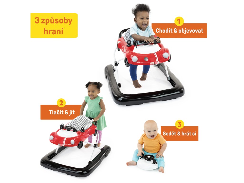 Toto detské chodítko Racer ponúka 3 režimy rastu s dieťatkom: tradičné auto chodítko, chodítko a prenosnú hračku. Spolu s volantom, radiacou pákou a kľúčom od auta na „zapnutie“ zábavy môžete posadiť dieťatko na sedadlo vodiča a rozvíjať jeho jemné motorické zručnosti. Zamilujú si skúmanie detailov auta a šoférovanie ako mama a otec... a volant vydáva zábavné cvakavé zvuky pre multizmyslovú zábavu.