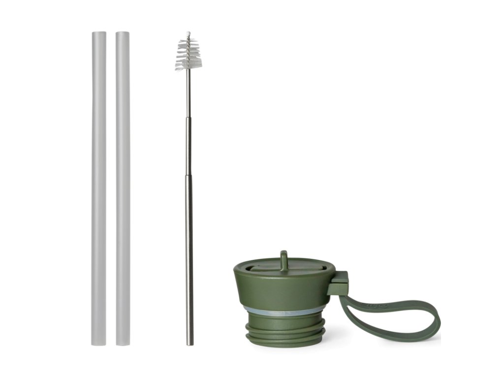 - Súčasťou balenia je uzáver s náustkom a slamkou, 1 kefka na čistenie slamky, 1 silikónový ochranný diel a 1 náhradná slamka