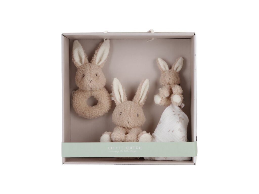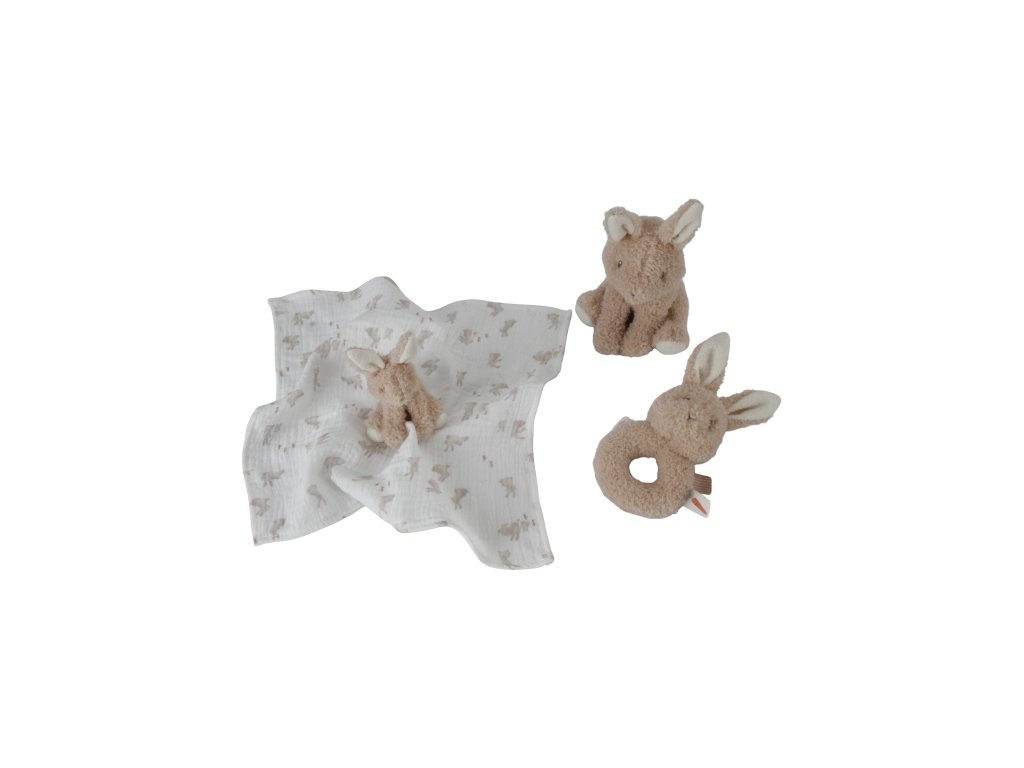 Darčekový box obsahuje tri hračky z jemného plyšu, ktoré lákajú na hranie i maznanie pred spaním v postieľke: králika, maznáčika a hrkálku. Hračky sú vhodné pre deti od narodenia a sada sa tak môže stať aj krásnym darčekom pre novonarodené bábätko.
