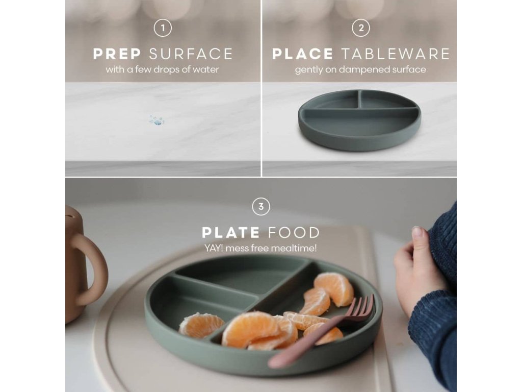 Mushie silikónové taniere s prísavkou v rôznych farbách! Tanier s prísavkou je ideálny pre tých najmenších, ktorí sa učia kŕmiť sami. Funkcia prisatia zaistí, že tanier zostane na svojom mieste a minimalizuje rozliatie okolo stola a podlahy. Tanier je rozdelený na tri veľkosti, ideálne porciované pre batoľatá. Potravinársky silikónový materiál vám umožní bezpečne zohriať jedlo priamo v tanieri. Detaily Mushie silikónového taniera:- Materiál: potravinársky silikón