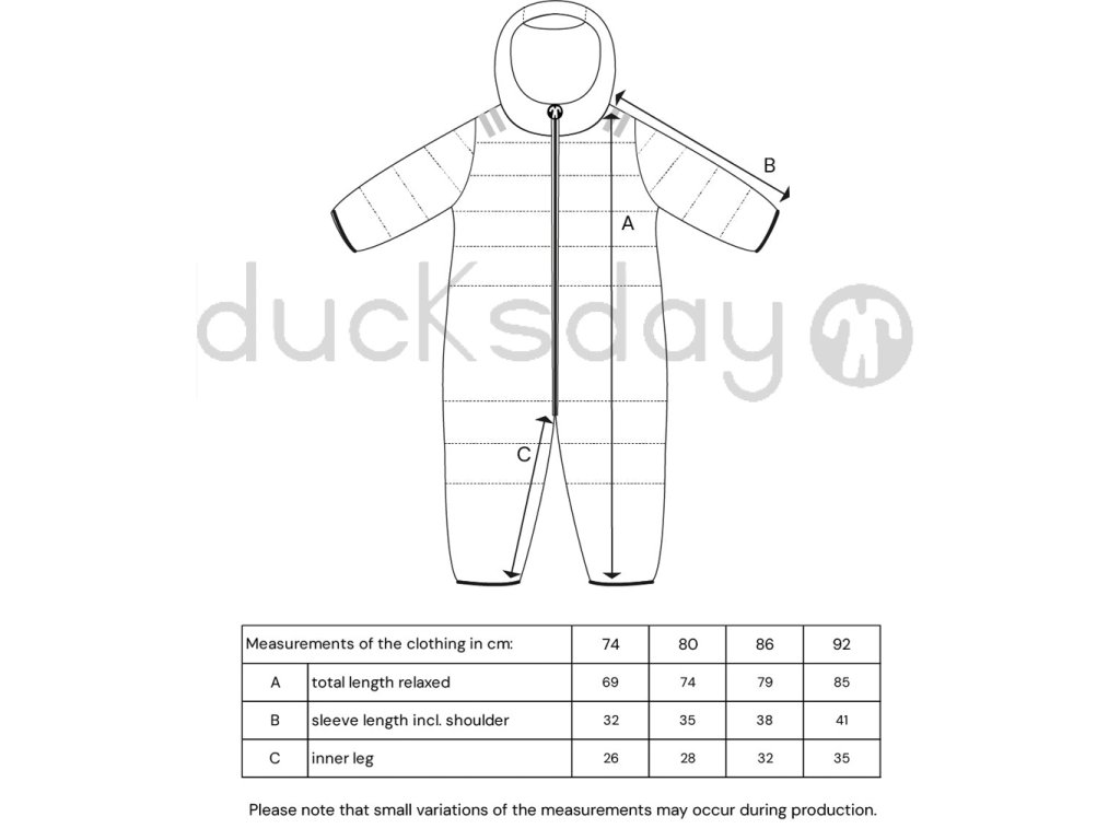 Kombinéza je vybavená dlhým zipsom (končí na chrbte), čo uľahčuje rýchlu výmenu plienky. Kombinéza má špeciálne manžety na rukávoch a nohách. Môžete ich použiť v závislosti od počasia a pohodlia.