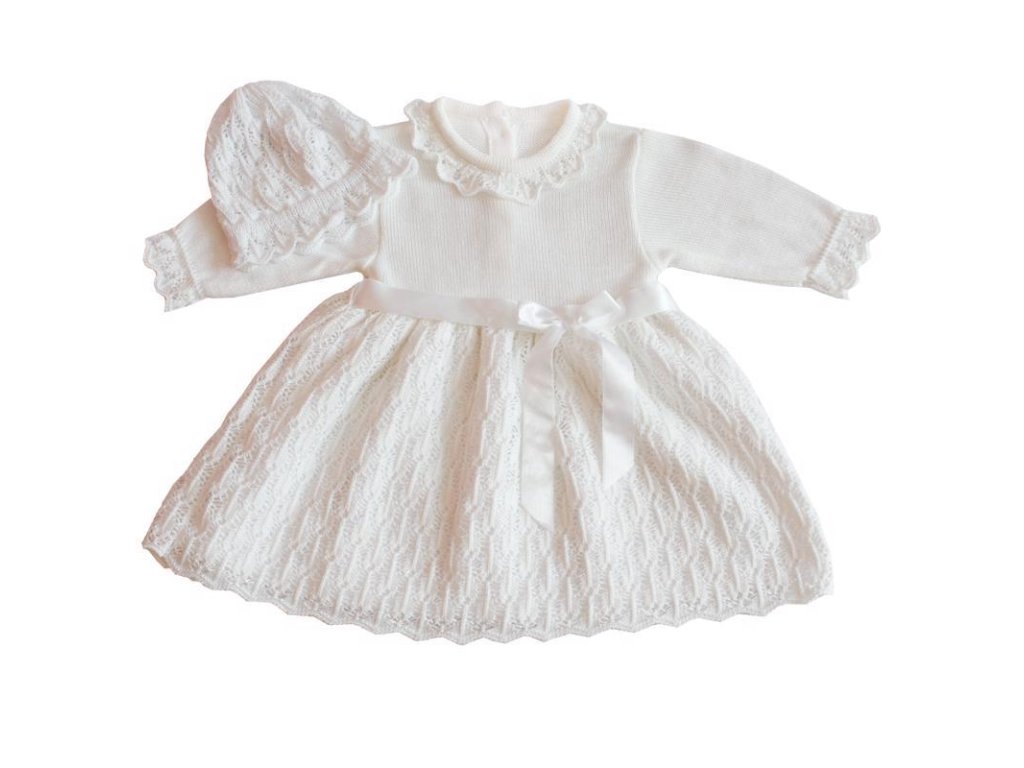 Súprava pozostávajúca zo šiat a čiapky je vyrobená z pleteniny s ozdobným ažurovým vzorom a ozdobnou stuhou.