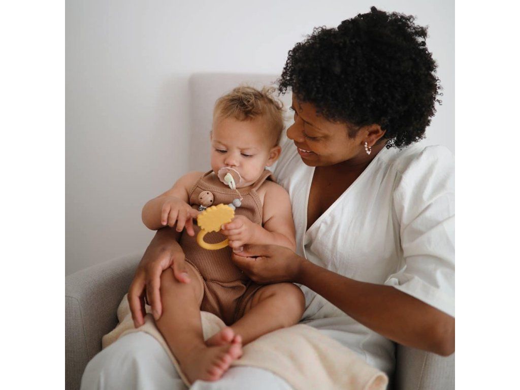 Mushie hryzadlo z potravinárskeho silikónu poskytuje úľavu pri prerezávaní zúbkov.