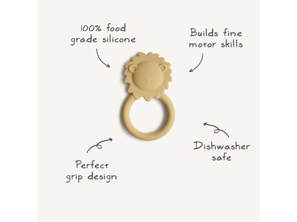 Roztomilé hryzadlo v tvare levíka je vyrobené z potravinárskeho silikónu a je vysoko odolné a ľahko sa čistí. Hravý dizajn podnecuje predstavivosť a kompaktná veľkosť uľahčuje držanie pre malé ručičky