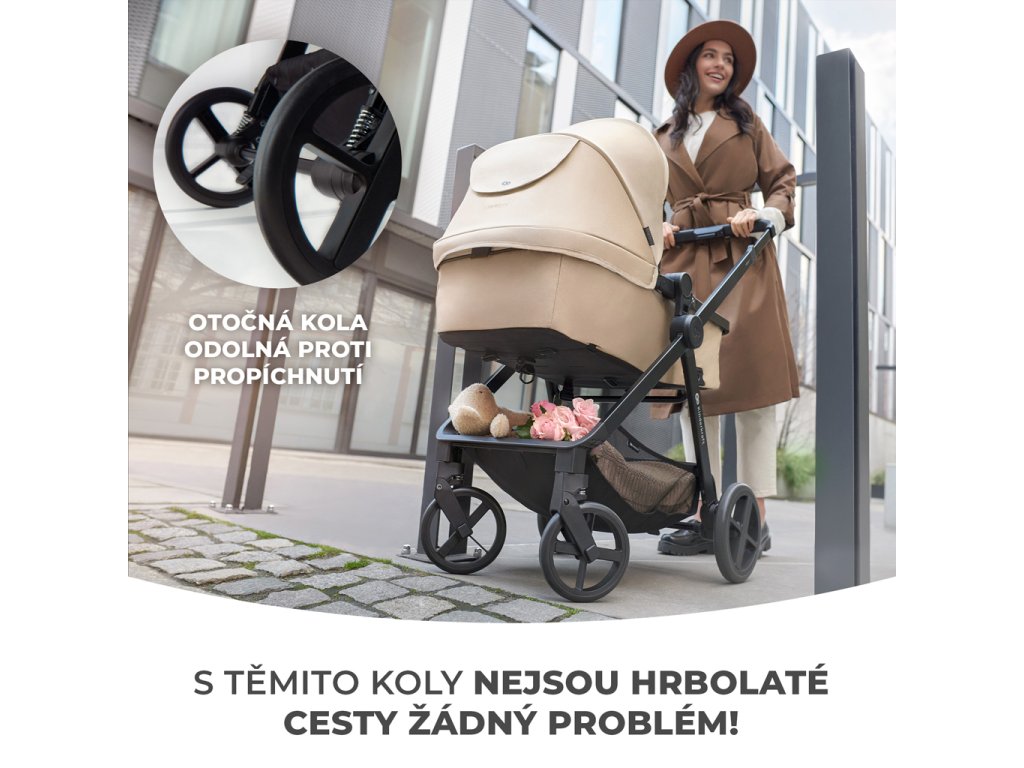 Odpružené kolesá sú odolné proti prepichnutiu a čo je najdôležitejšie, nie je potrebné ich dofukovať. Sú vždy pripravené na prechádzku! Predné kolesá sa otáčajú o 360 stupňov a majú aretáciu v priamom smere, ideálne do náročnejšieho terénu. S nimi prekonáte každú prekážku.