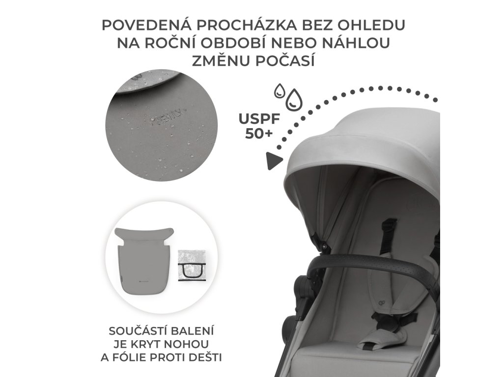 - Strieška vyrobená z nepremokavej látky s UPF50+ filtrom