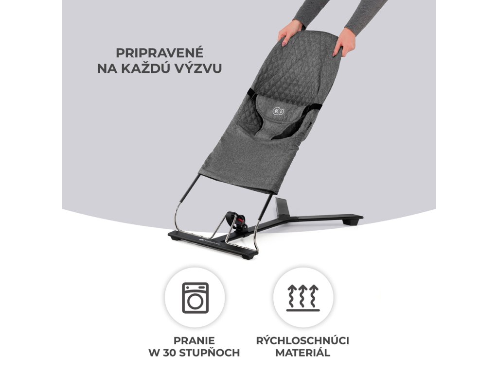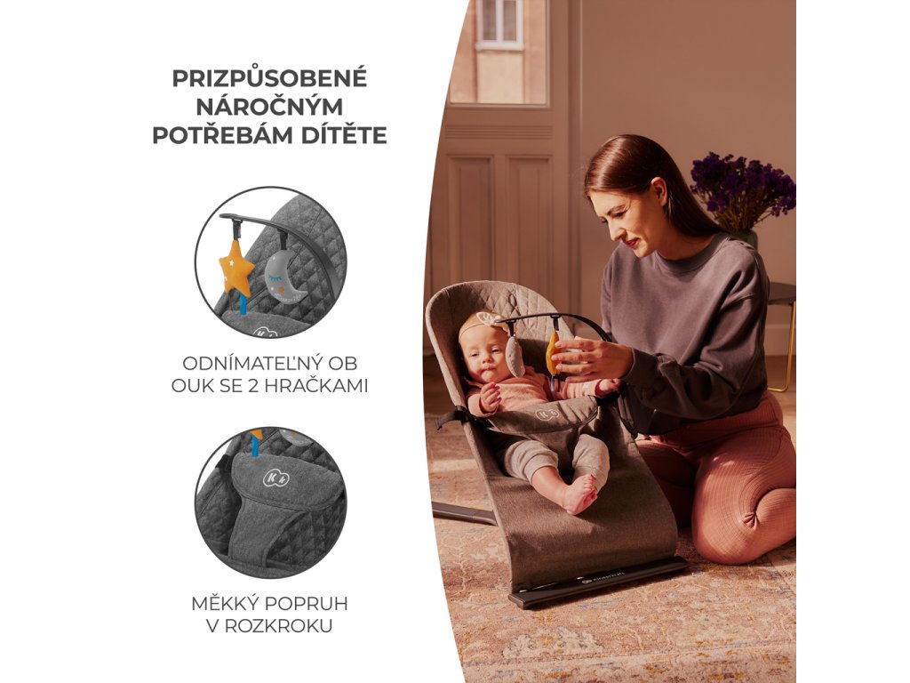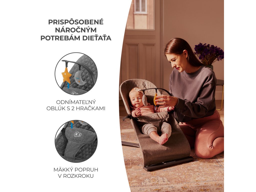 Lehátko MIMI je čistý minimalizmus uzavretý do nádhernej podoby. Poskytuje bezpečnosť, pohodlie a zároveň je veľmi vkusné. Pomôže upokojiť dieťa dokonca za veľmi nepokojných dní, zároveň mu nedodá príliš veľa impulzov. Ideálne prispôsobené sedadlo z príjemnej tkaniny rovnomerne rozkladá váhu dieťaťa a podporuje prirodzené držanie tela pri odpočinku.