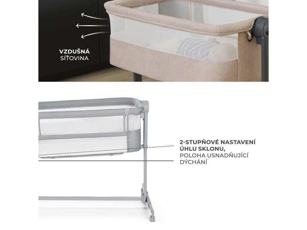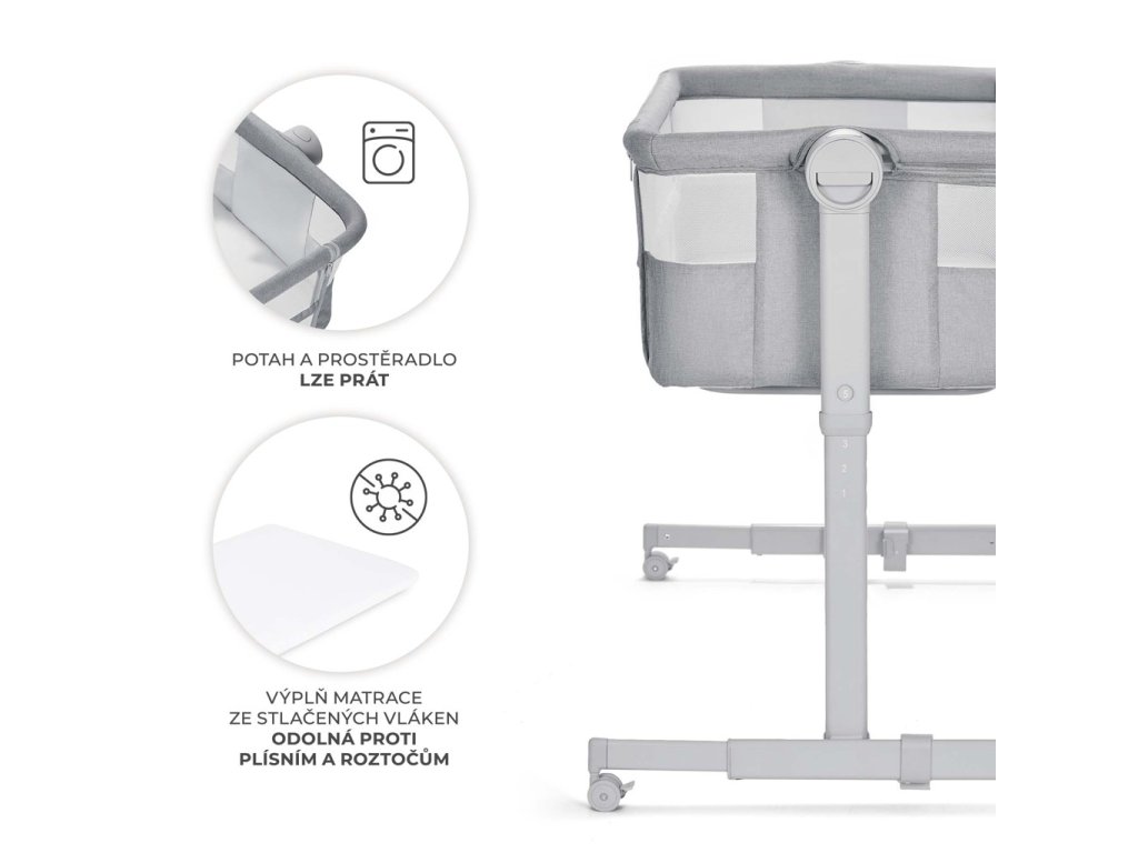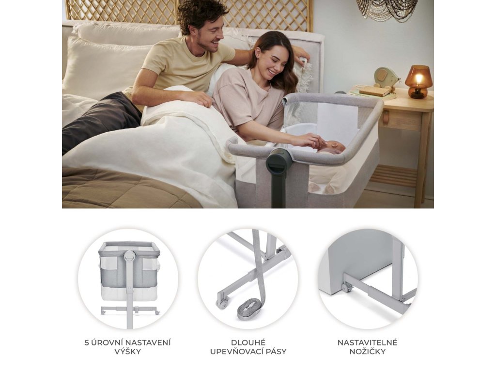 Plynulé a jednoduché nastavenie výšky postieľky umožňuje bez námahy prispôsobiť prístelku výške postele rodiča. Nastavte ju na jednu z 5 úrovní, nastavte nohy v takej vzdialenosti, aby postieľka presne priliehala k posteli, a pripevnite ju pomocou špeciálnych popruhov, aby ste vytvorili bezpečný priestor na spanie pre vaše dieťa. Poskytnete priestor sebe a zaistíte hygienu spánku, ale zároveň budete mať svoje dieťa na dosah ruky.