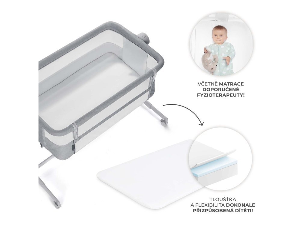Táto multifunkčná prístavná postieľka má až 5 výškových úrovní, takže ju môžete ľahko prispôsobiť výške vašej postele. Umožňuje tiež nastaviť uhol matraca na jednu z dvoch úrovní - pohodlná možnosť pre deti, ktoré často grckajú alebo sú choré a majú nádchu. Sieťka okolo celej postieľky vám umožní diskrétne sledovať, čo vaše dieťa v danom okamihu robí, a vďaka 4 kolieskam môžete postieľku NESTEE UP 2 ľahko premiestňovať z miesta na miesto. Okrem toho sa postieľka dodáva s matracom, ktorý má správnu hrúbku a hustotu odporúčanú pre bábätká - zabezpečuje správnu polohu tela vášho dieťaťa počas spánku a má pozitívny vplyv na jeho vývoj a zároveň je odolný voči plesniam a roztočom.