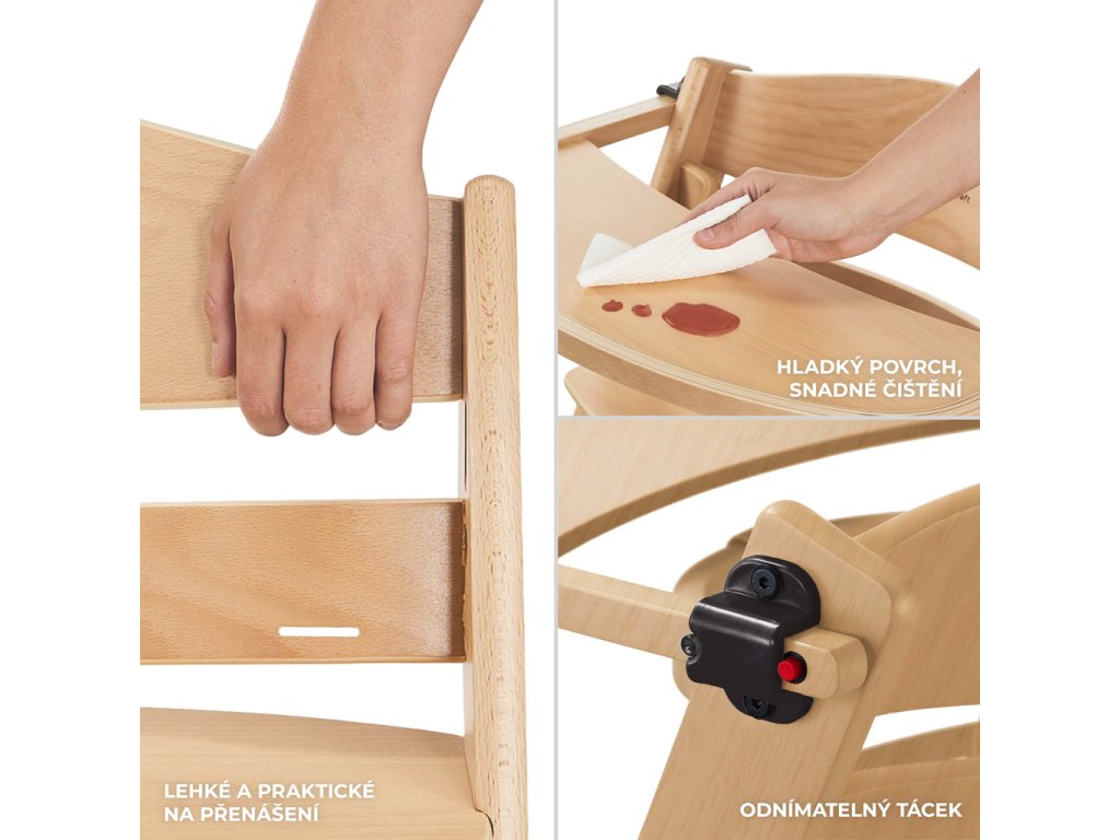 - stolička sa ľahko čistí aj po mimoriadne „vzrušujúcom“ obede. Stačí ju ihneď utrieť vlhkou handričkou a potom suchým papierom.