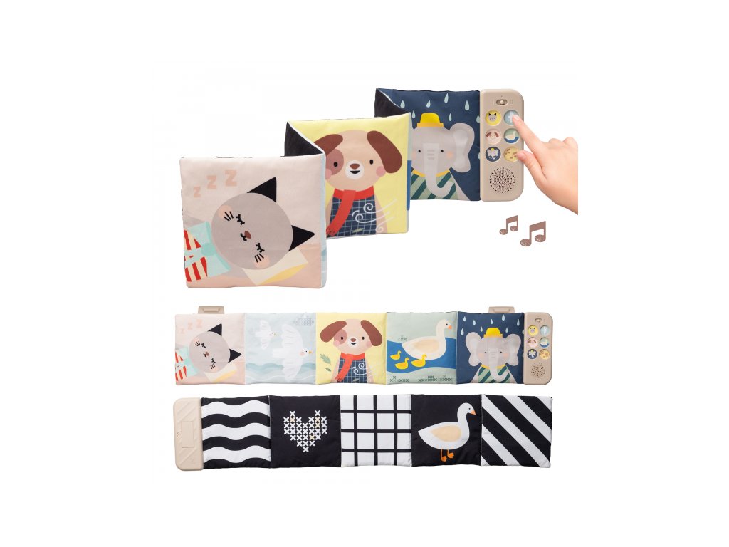 Obojstranná textilná knižka Taf Toys pomôže zabaviť a upokojiť bábätko už od narodenia. Knižka samostatne stojí a je tak ideálna na hranie na brušku. Vďaka klipom ju ľahko umiestnite aj do kočíka na zabavenie dieťaťa na cestách.