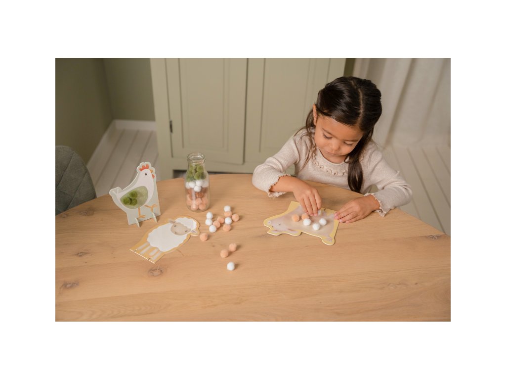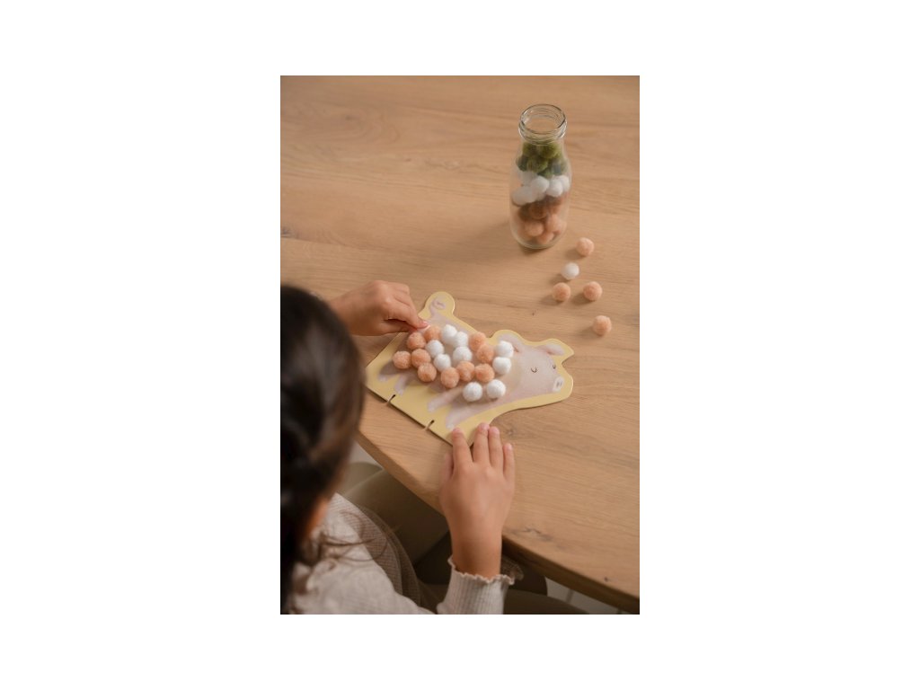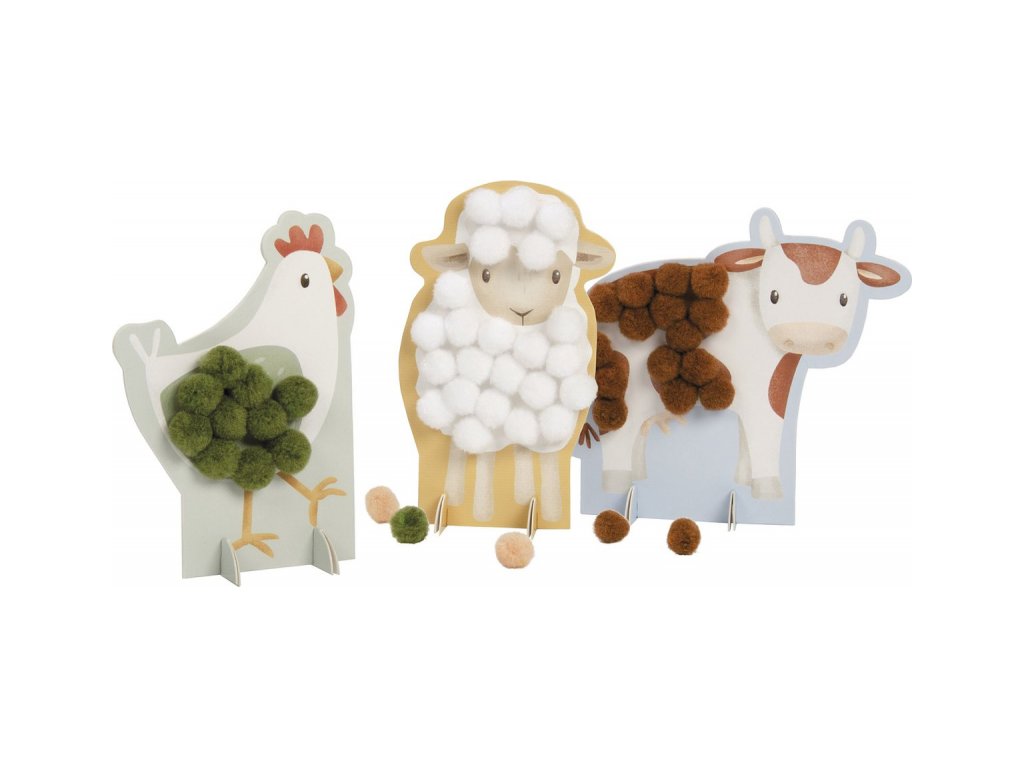 Originálna sada obsahuje 80 brmbolcov v rôznych farbách a štyri kartičky v podobe sliepočky, kravičky, ovečky a prasiatka. Kartičky majú samolepiaci povrch, na ktoré dieťa lepí brmbolce v správnych farbách. Po dokončení zvieratka vďaka stojanu samostatne stojí a môžete ich využiť ako krásnu dekoráciu v detskej izbe.