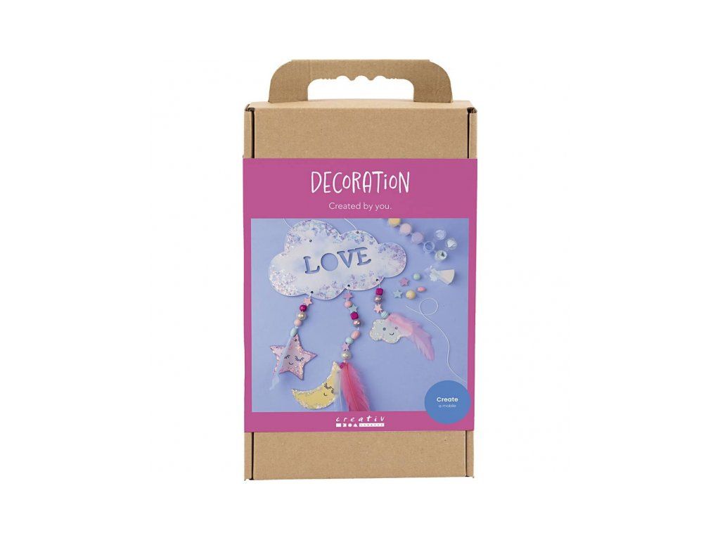 Originálna kreatívna súprava na výrobu závesnej dekorácie s motívom nočnej oblohy. Zábavná sada deťom umožní spoločne s rodičmi vytvoriť originálnu dekoráciu do detskej izby: drevenú dekoráciu si nafarbí, dozdobí trblietavou hmotou a doplní korálky a pierky pre ľahký, snový efekt. Výsledkom je krásna dekorácia, ktorú môžete zavesiť do okna, zo stropu alebo nad posteľ.
