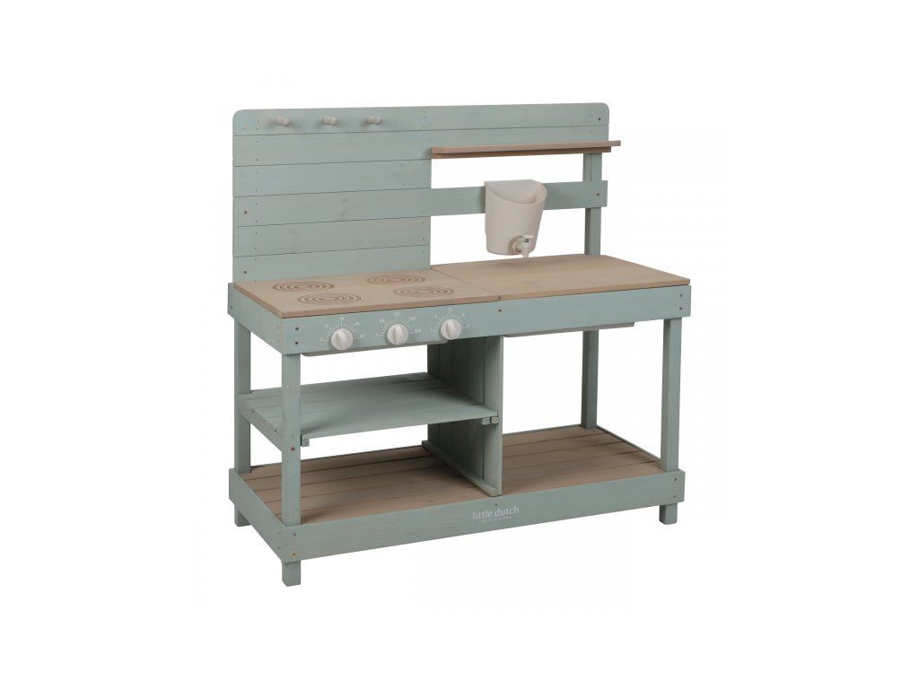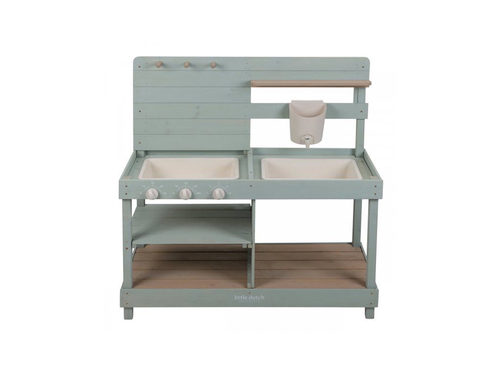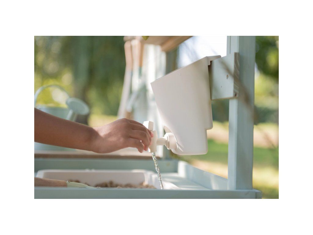 Drevená vonkajšia kuchynka je ideálna hračka na záhradu pre malých záhradníkov i malých kuchárov, ktorí milujú tvorenie z piesku, vody a blata. Kuchynka so sporákom má otočné gombíky, dva drezy a dokonca funkčný kohútik s nádržkou na vodu, takže si dieťa môže samo pustiť vodu a doplniť suroviny na „varenie“ vonku. Praktický detail sú tiež dve veľké vaničky schované pod odklopnými doskami, ktoré sú ako stvorené na hranie s vodou.