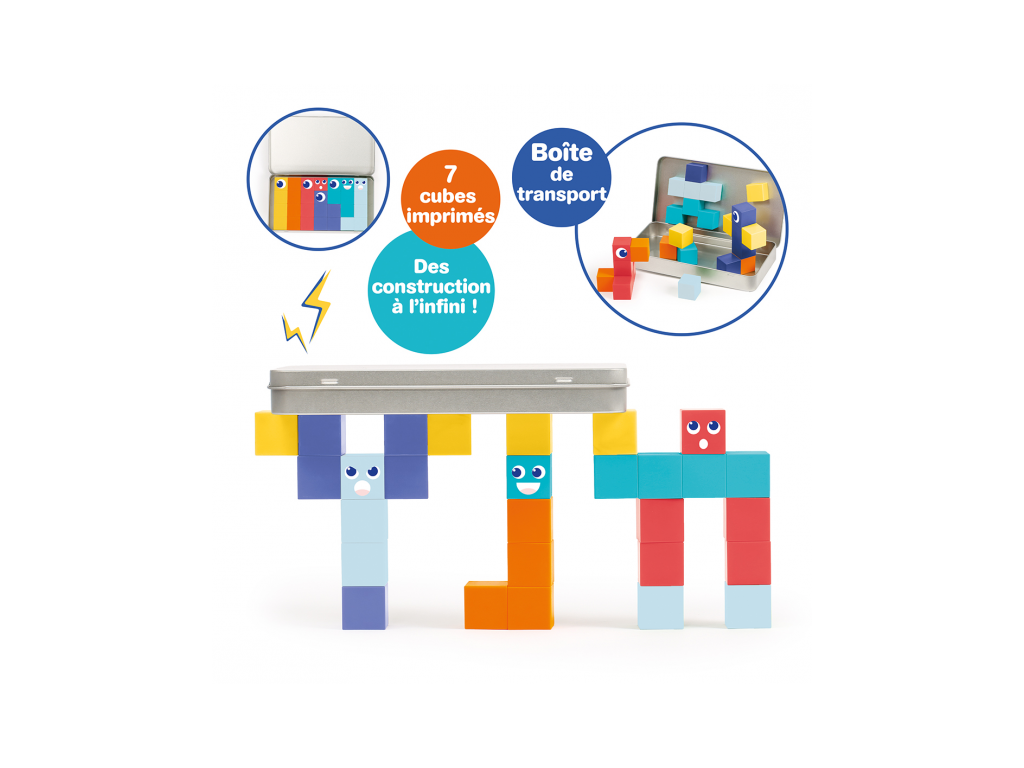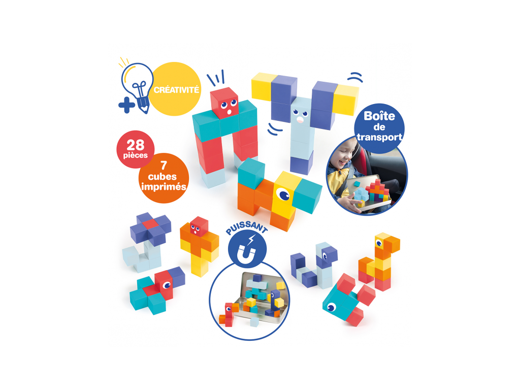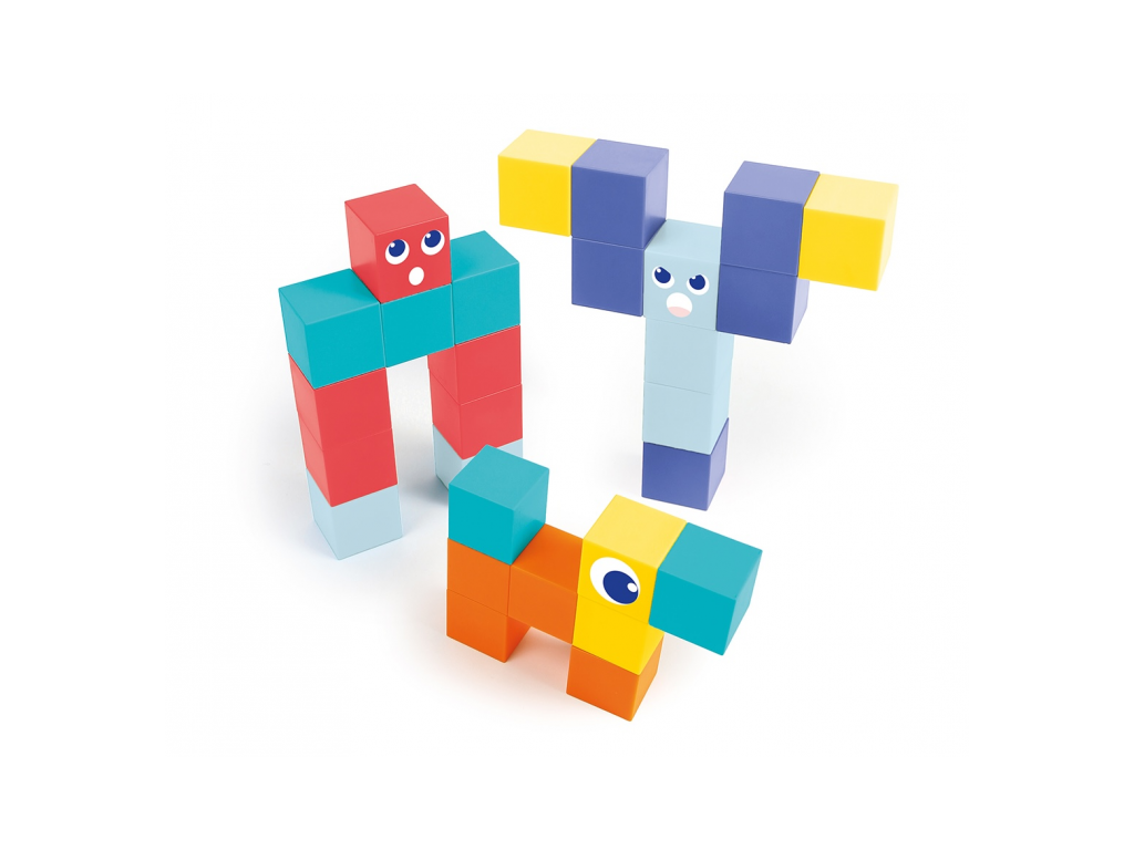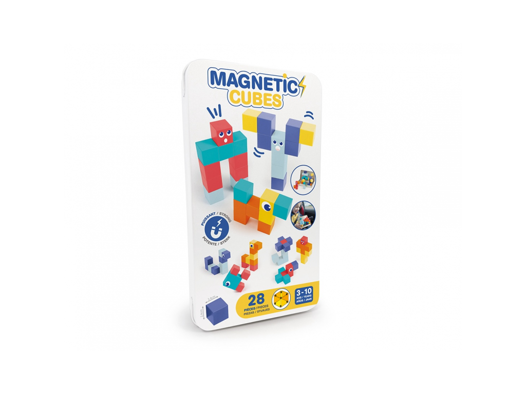 Magnetická stavebnica Ludi s kockami je praktická cestovná súprava, ktorá zabaví deti doma aj na cestách. Obsahuje 28 magnetických kociek, niektoré s motívmi očí a tvárí, vďaka ktorým deti ľahko vytvárajú postavičky, zvieratká aj malé stavby. Kocky sa skladajú intuitívne a magnety podporujú skúšanie rôznych kombinácií, rovnováhy a priestorového usporiadania. Súčasťou je kovová krabička, ktorá slúži ako úložisko aj magnetická hracia plocha, takže je stavebnica ideálna do auta, do reštaurácie alebo na cesty. Hra rozvíja jemnú motoriku, koordináciu oko ruka, logické uvažovanie aj rozprávanie príbehov.