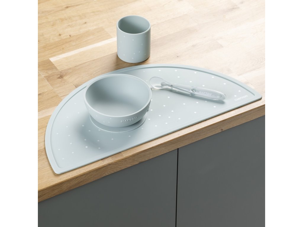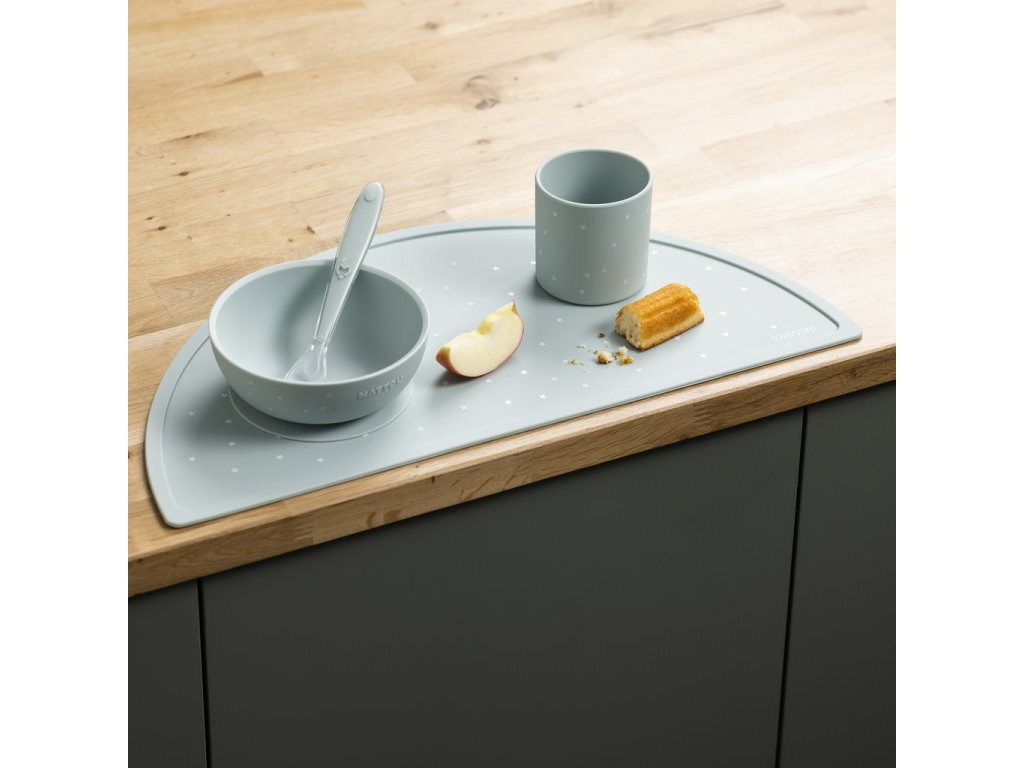 S touto elegantnou silikónovou jedálenskou súpravou môže vaše dieťatko jesť bez obáv. Zvýšený okraj taniera a prísavná podstava zabraňujú vylievaniu jedla na zem. Lyžička je dokonale prispôsobená malým rúčkam a ústam bábätiek a malých detí, takže sa stáva ideálnym pomocníkom pri kŕmení a učení sa samostatnosti.