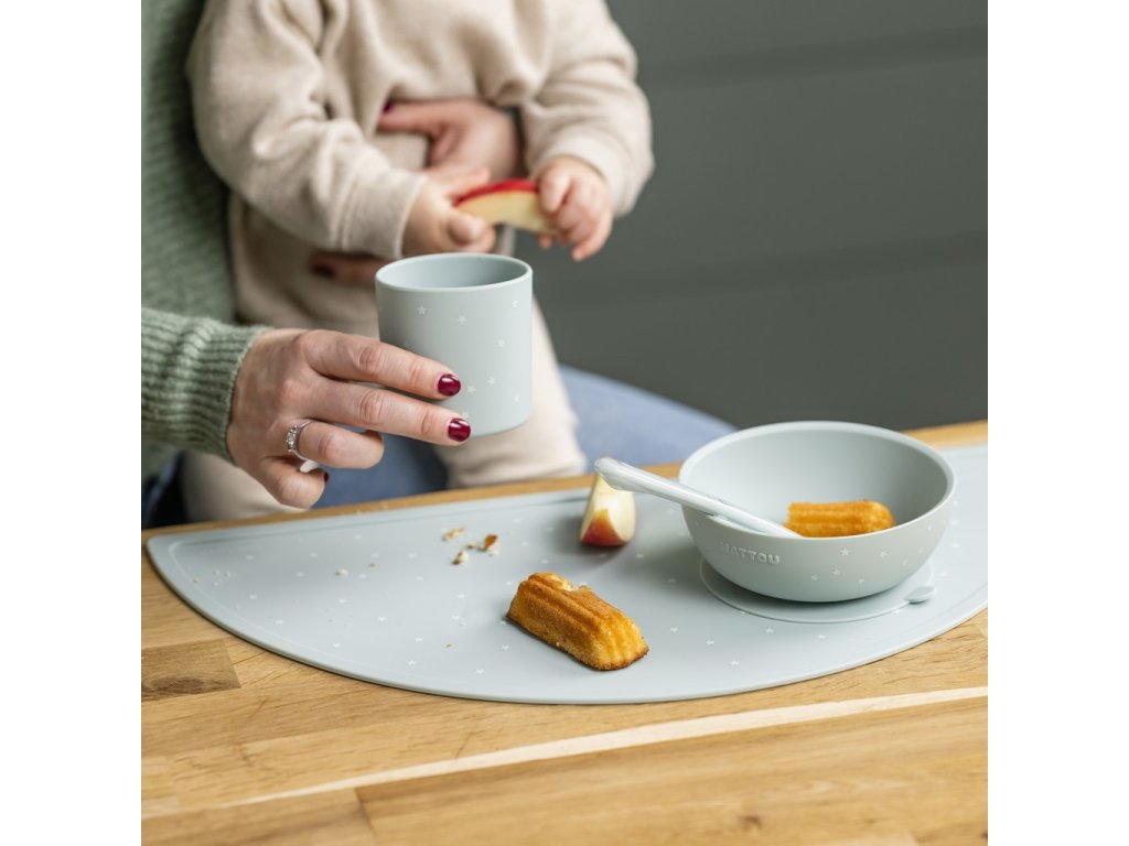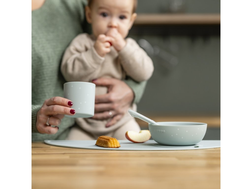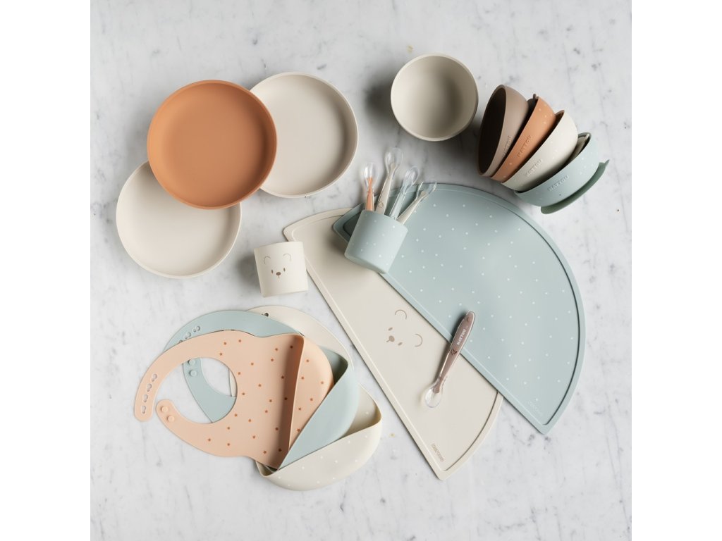 - Jedálenská súprava pre bábätká a malé deti: tanier, miska, pohár a lyžička z mäkkého silikónu.