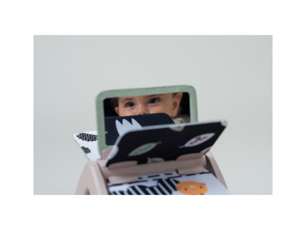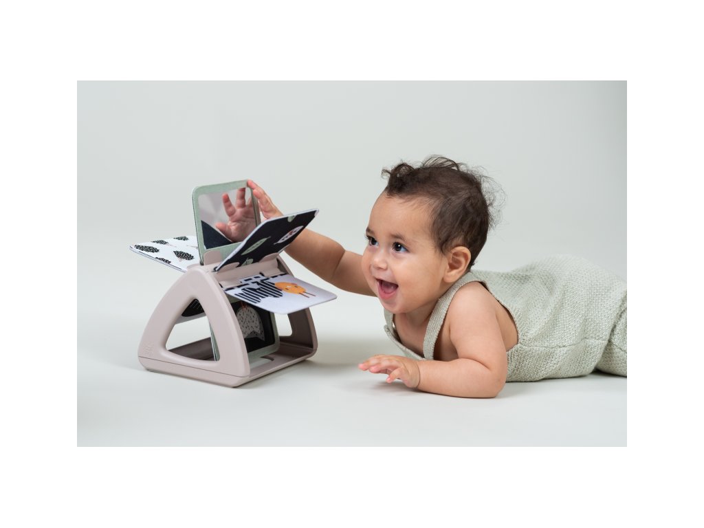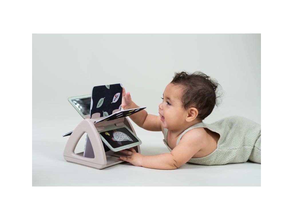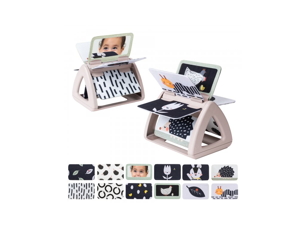 Od 2 mesiacov: výrazné obrázky, bezpečné zrkadlo, hologramový trblietavý obrázok a hrkajúci zvuk pri otáčaní jednotlivých stránok upútajú pozornosť dieťaťa pri hre na brušku
