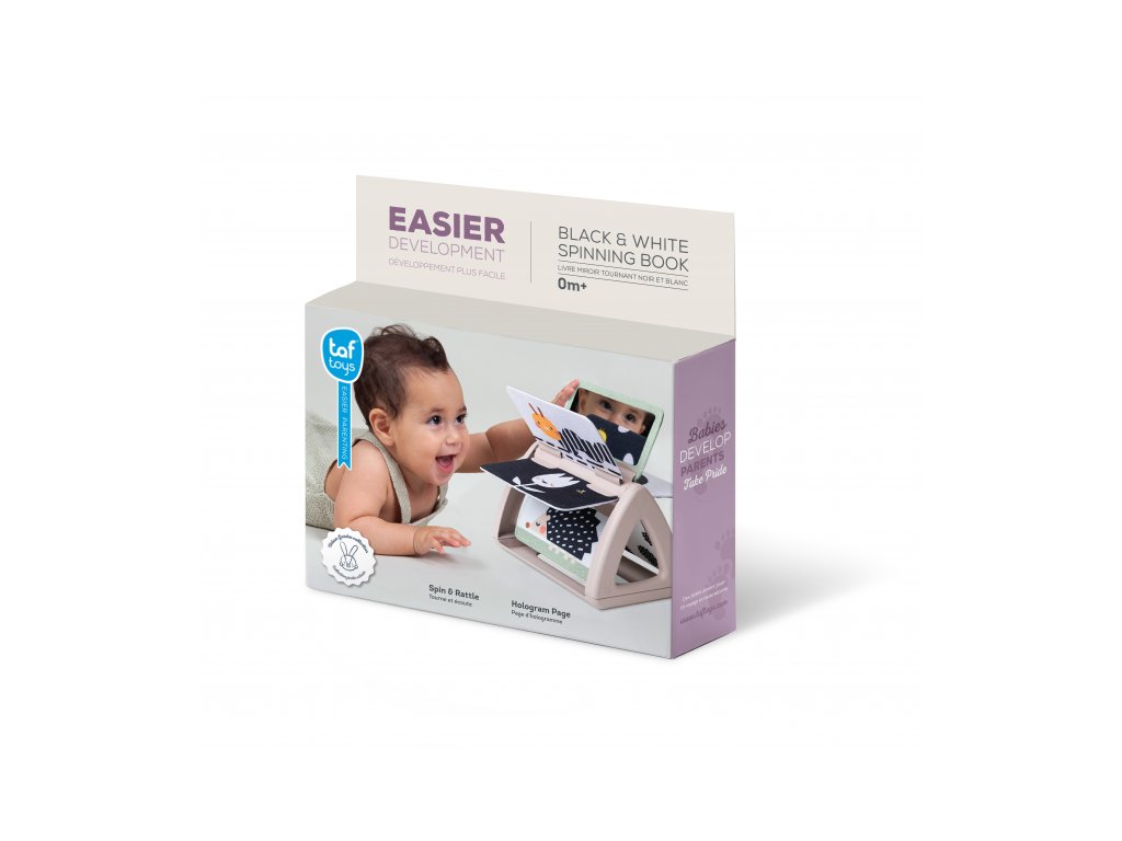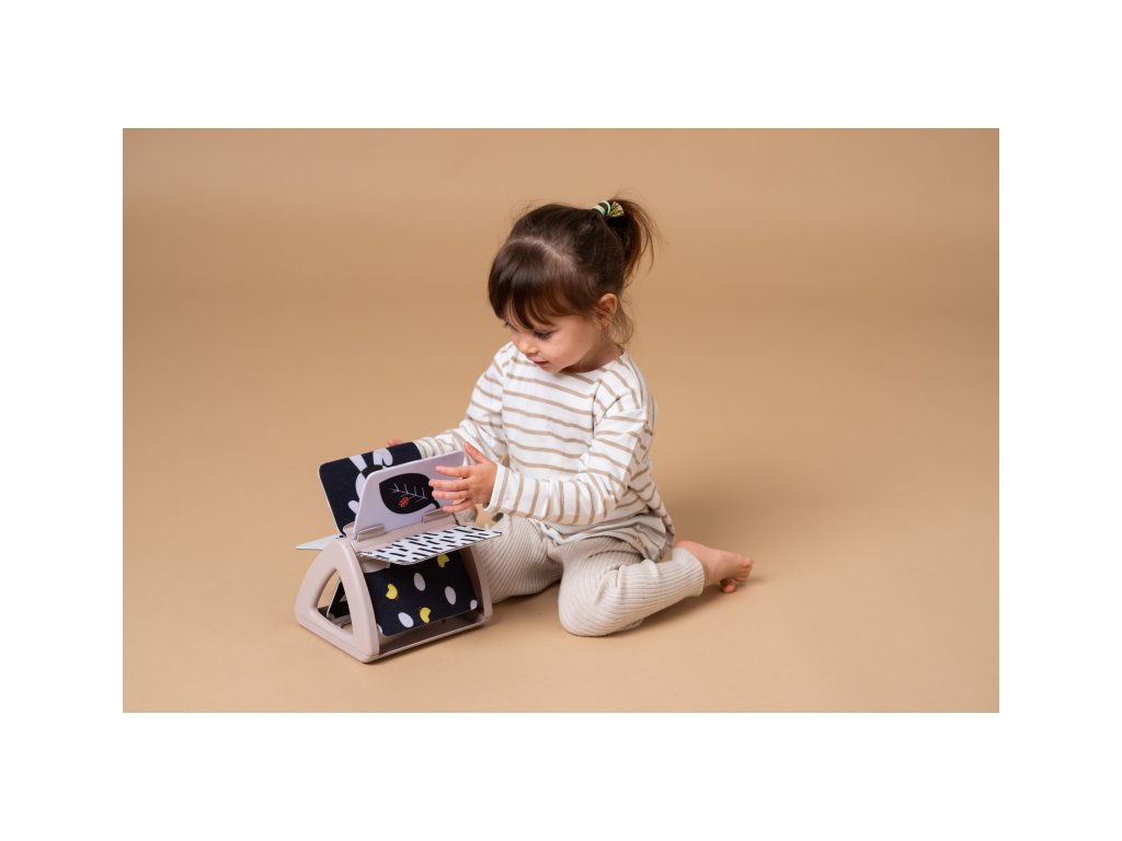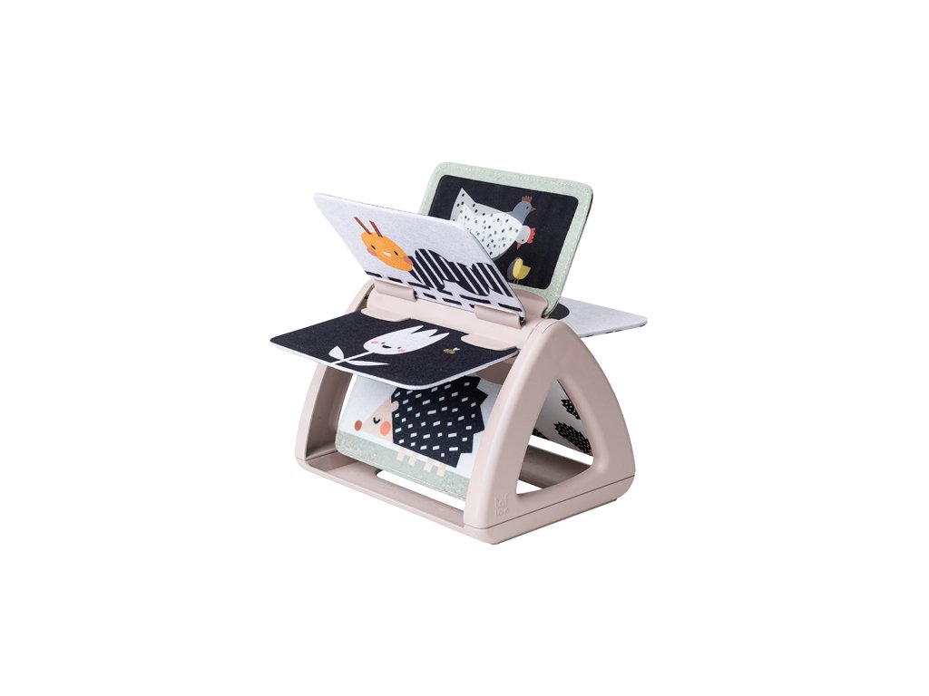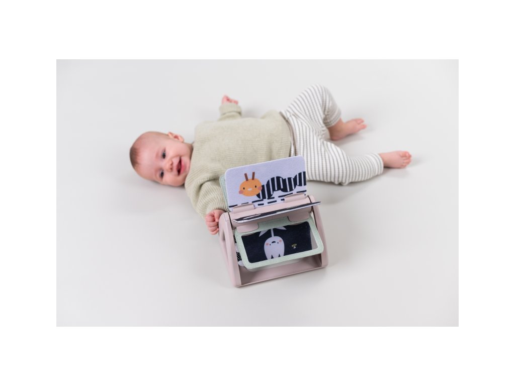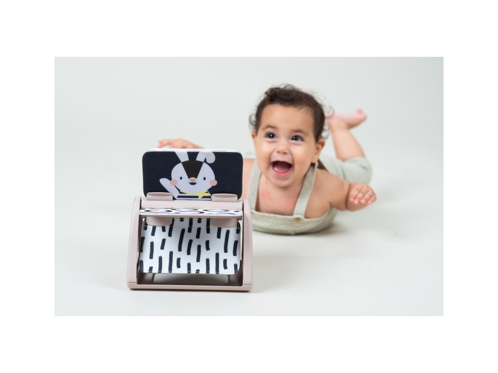 Od 2 mesiacov: výrazné obrázky, bezpečné zrkadlo, hologramový trblietavý obrázok a hrkajúci zvuk pri otáčaní jednotlivých stránok upútajú pozornosť dieťaťa pri hre na brušku