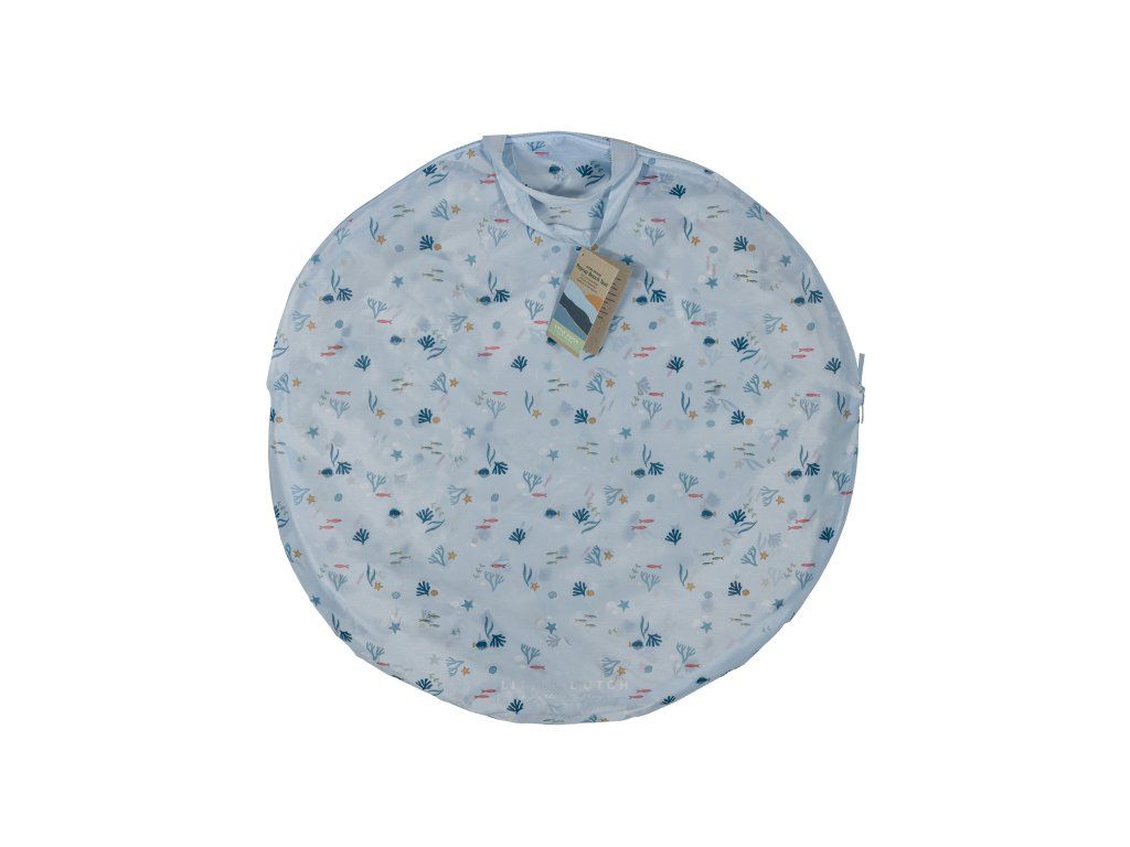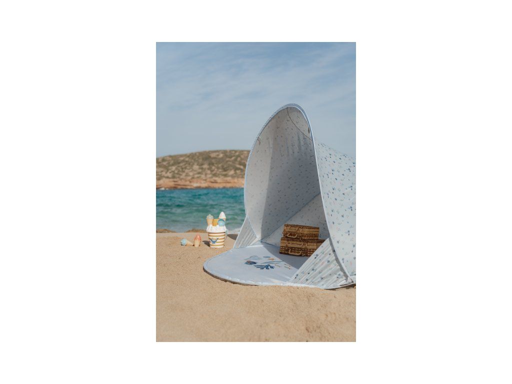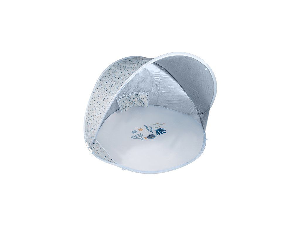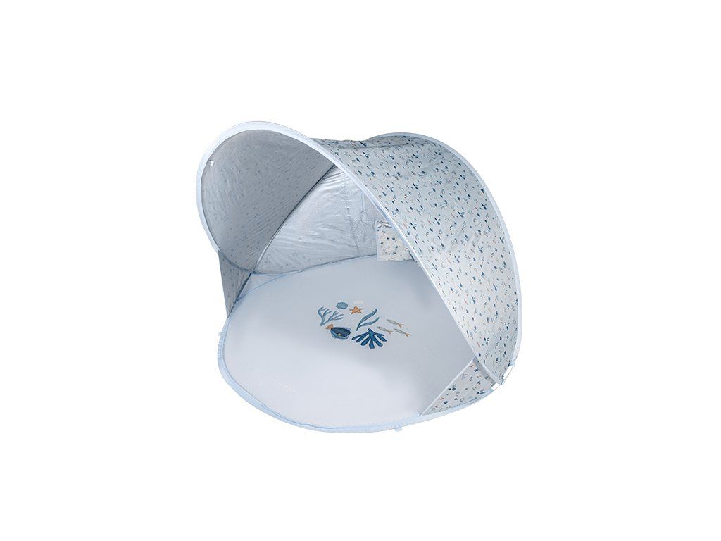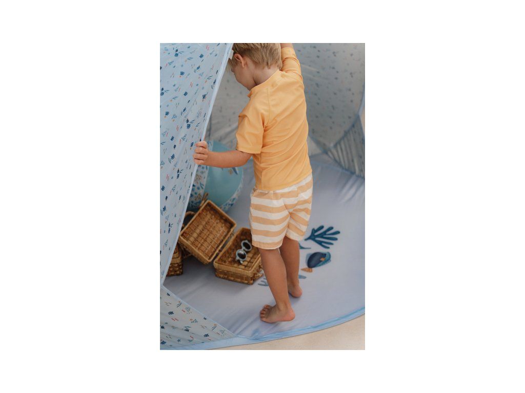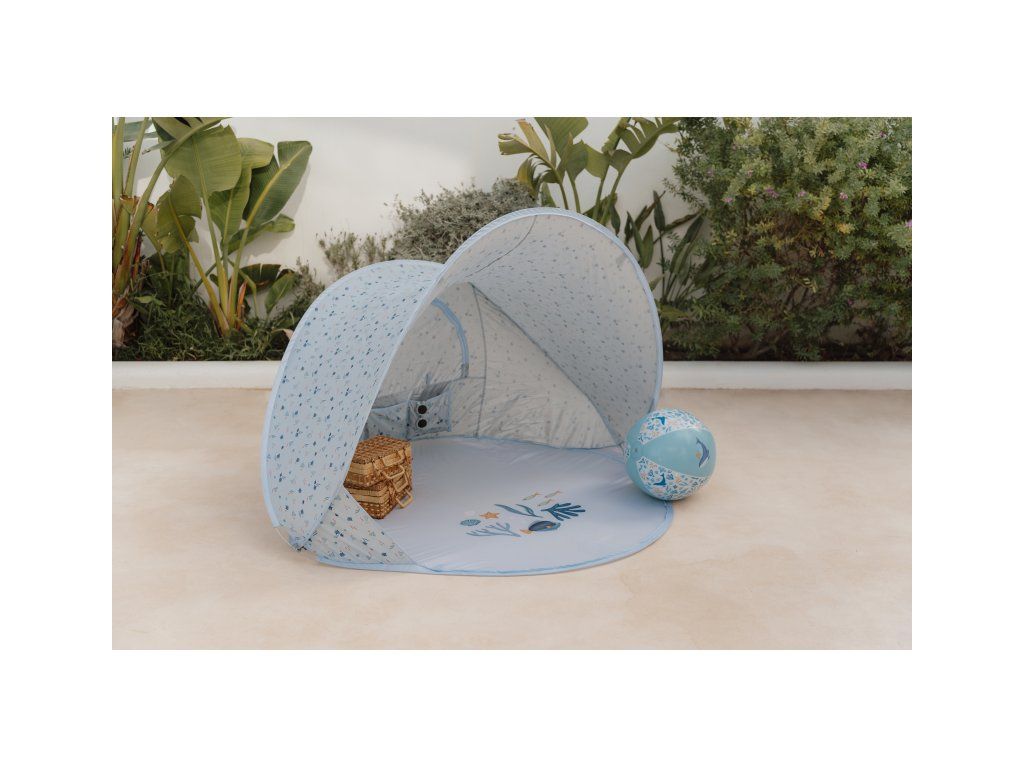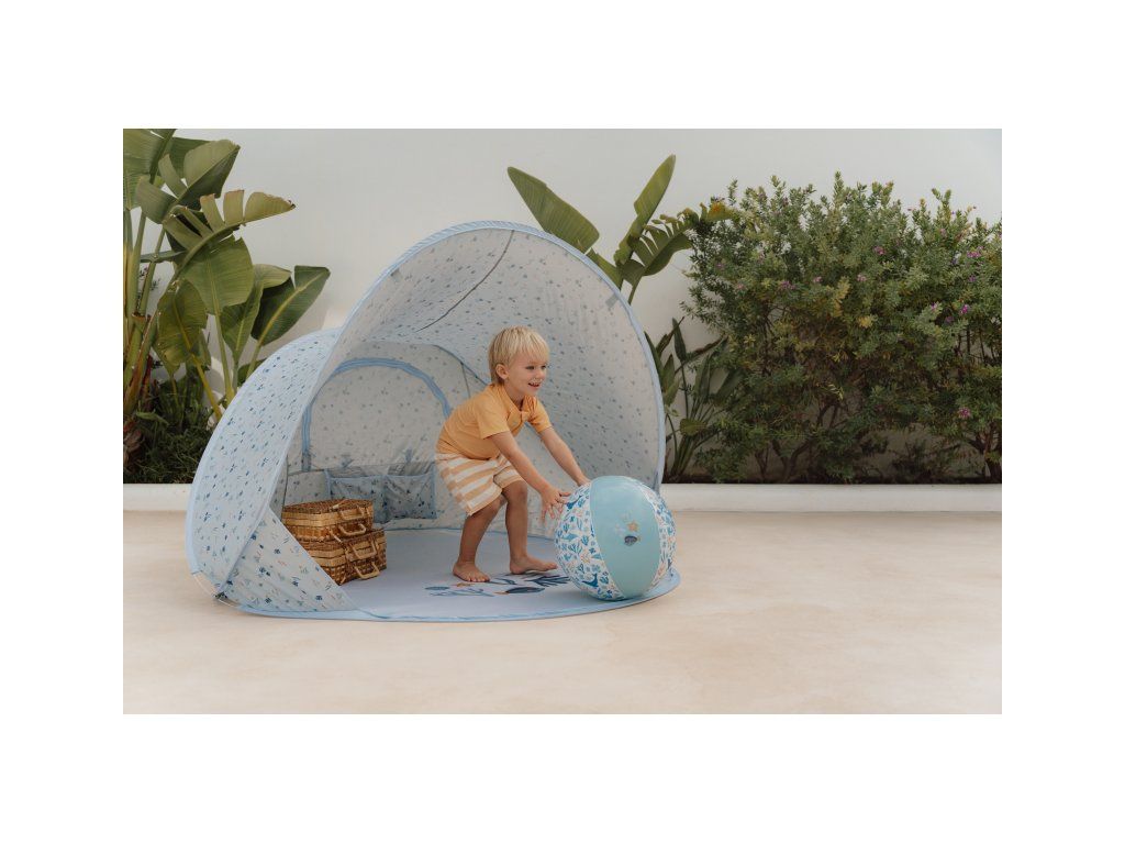 Prenosný skladací stan s UV faktorom 40+ na ochranu dieťaťa pred slnkom na záhrade, na pláži či na výletoch do prírody. Stan umožňuje jednoduchú ventiláciu vďaka zadnému okienku na zips. Dve vrecká na vnútornej stene ponúkajú priestor na uloženie drobností.