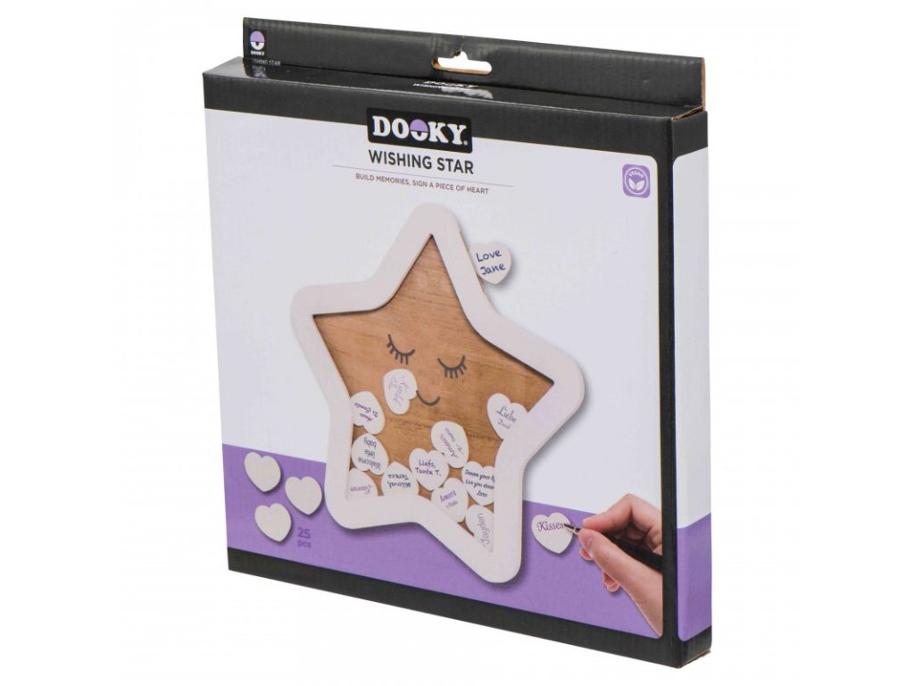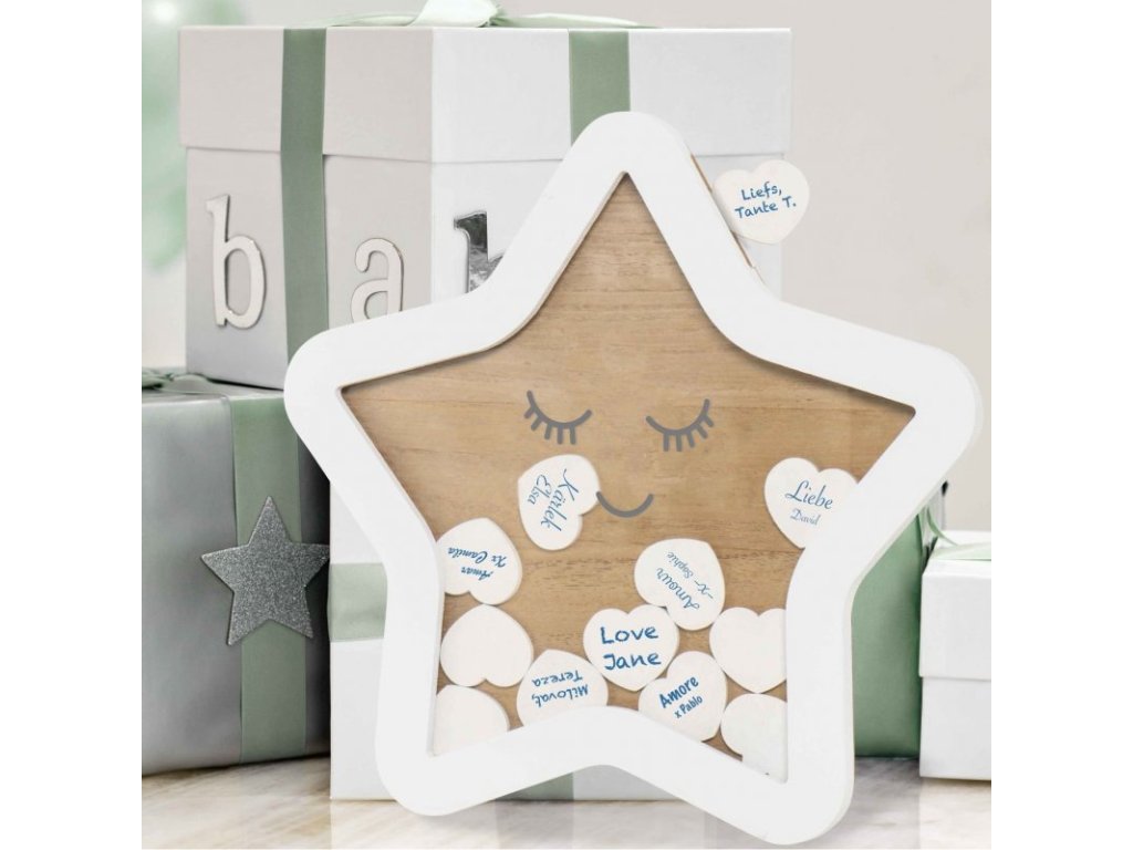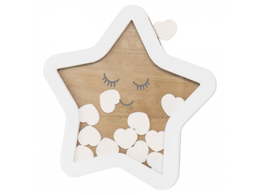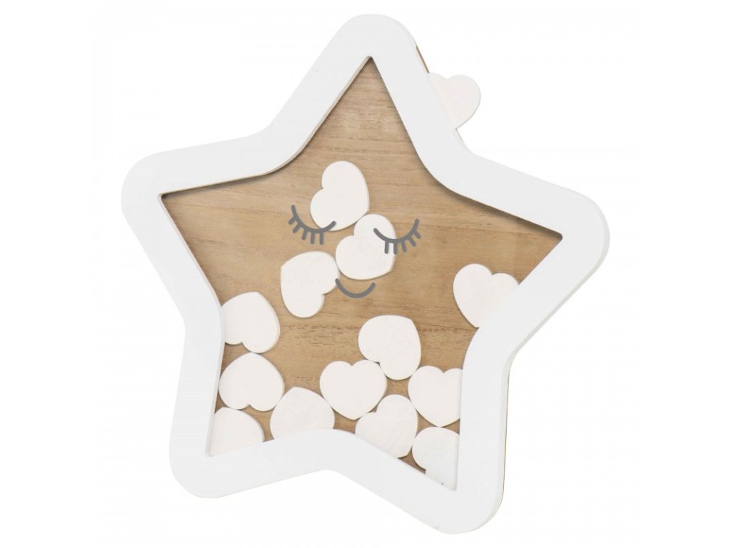 - balenie obsahuje 1 veľkú hviezdu (25x25x1,2cm) a 25 bielych popisovateľných srdiečok (3,5cm x 2,5cmx0,2cm)