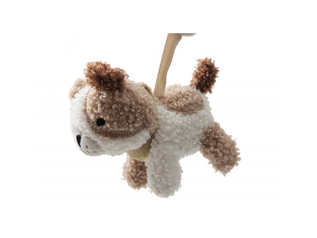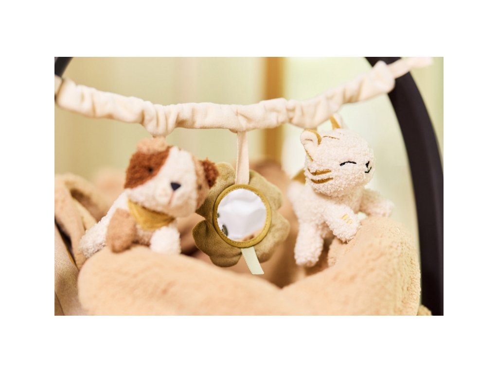 Reťaz na kočík či autosedačku so zavesenými hračkami v podobe psíka, mačičky a štvorlístka s bezpečným zrkadlom zabaví vaše bábätko v kočíku či autosedačke. Mäkké hračky vyrobené z jemného plyšu cinkajú a ponúkajú rôzne textúry na skúmanie. Hračky stimulujú koordináciu ruka/oko dieťaťa.