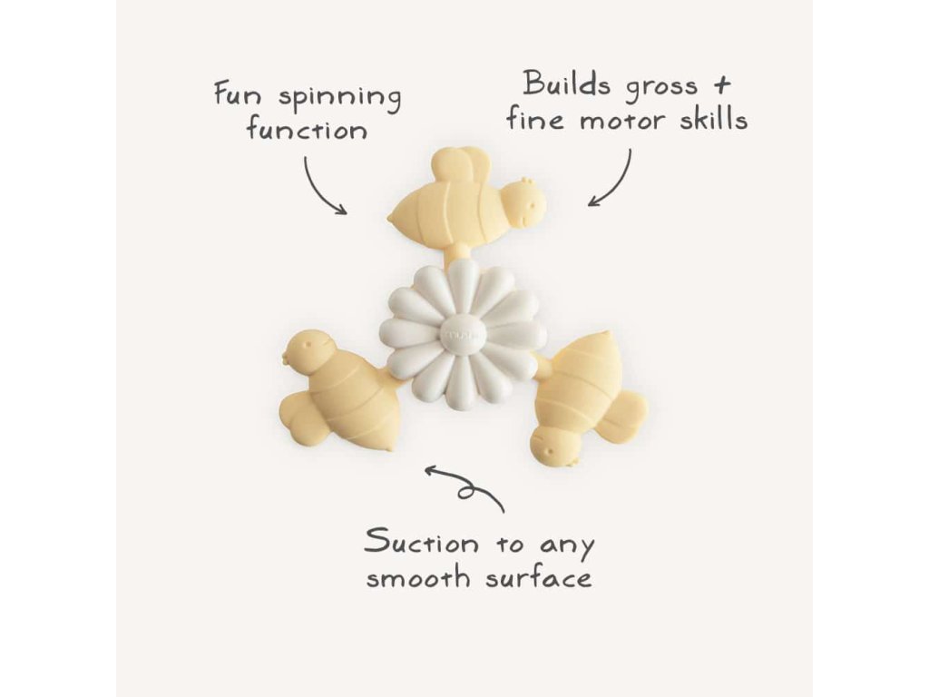 Mushie Spinner hračka v hravých dizajnoch podnieti predstavivosť tých najmenších. Hračka je vyrobená z plastu a potravinárskeho silikónu a je navrhnutá tak, aby deťom vytvárala zmyslové zážitky. Má tiež prísavku, ktorá zaisťuje, že hračka zostane na svojom mieste – to zabraňuje náhodným pádom a podporuje samostatnú hru. Vyskúšajte funkciu prísavky na dverách, stoličkách, vo vani atď. Hračka spinner je dokonalá zábava doma aj na cestách Mushie Spinner Toy – detaily: