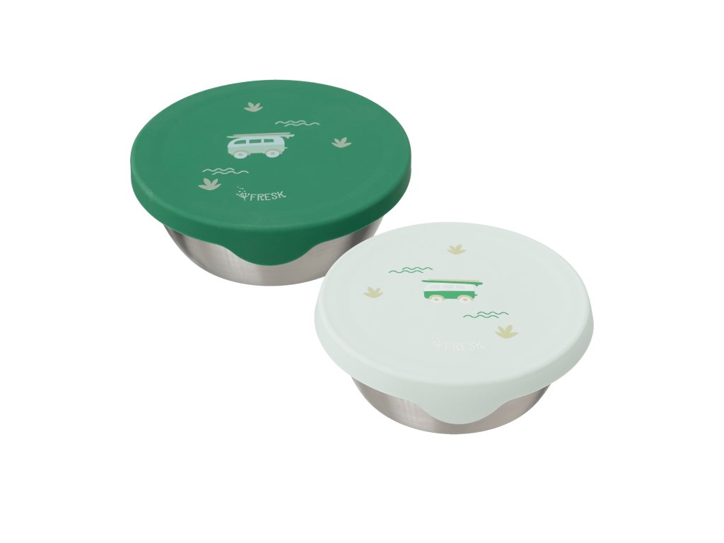 Dve dózy sú vyrobené z pevnej nehrdzavejúcej ocele a majú praktické silikónové viečka. Oceľové dno zabezpečuje, že nenaťahujú farbu ani vôňu z potravín, a flexibilné silikónové viečko ľahko otvoria aj malé detské rúčky.