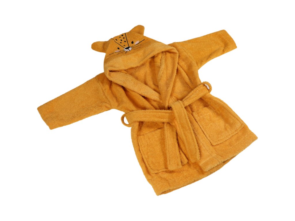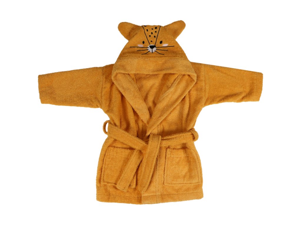 Tento detský župan je perfektným doplnkom pri kúpaní, a keď si dieťa nasadí kapucňu, objaví sa roztomilá tvárička a ušká leoparda Lennyho.