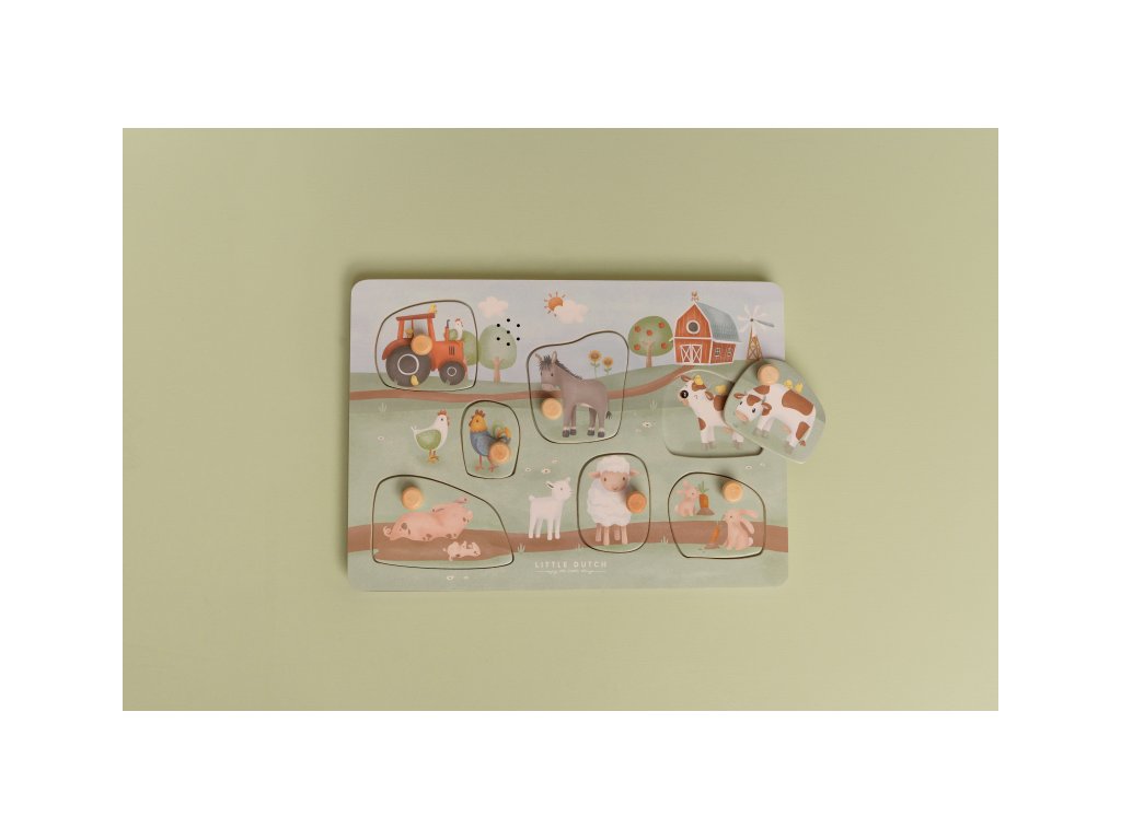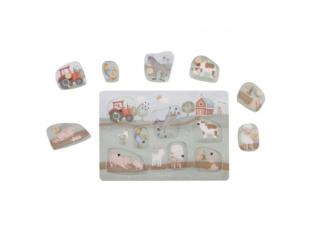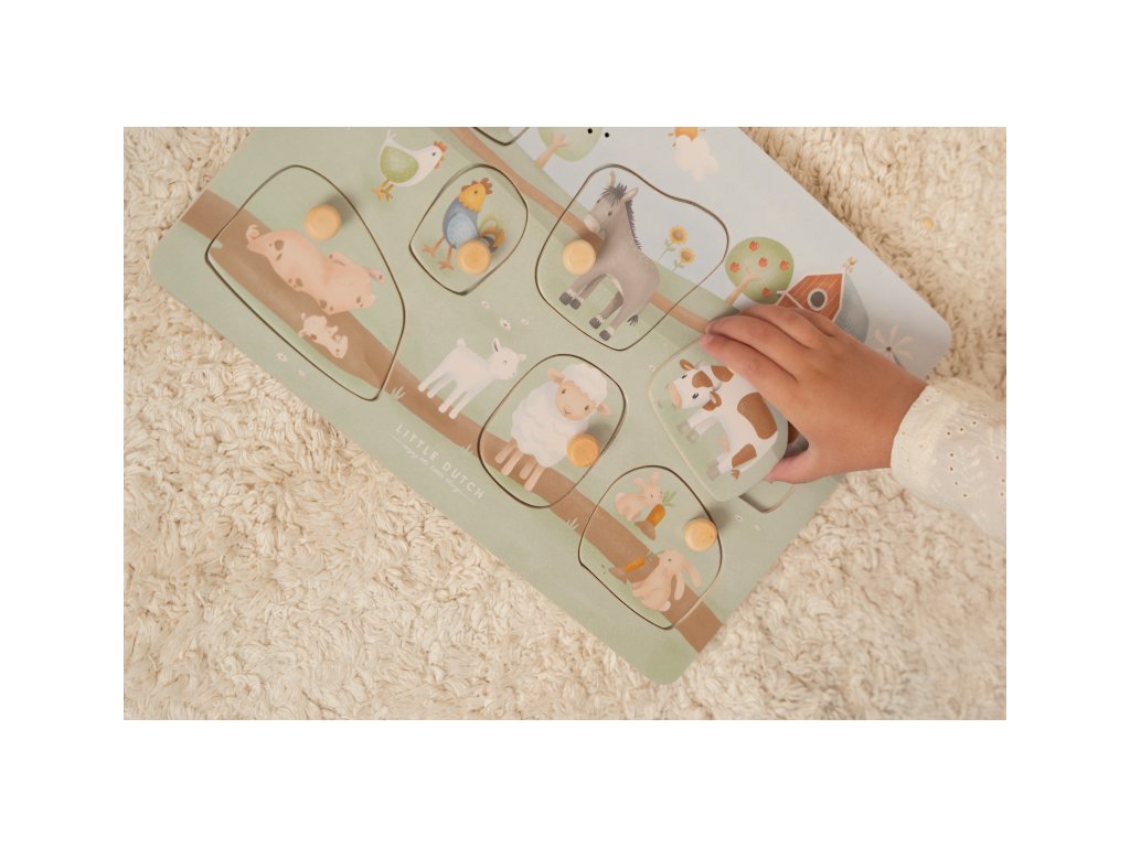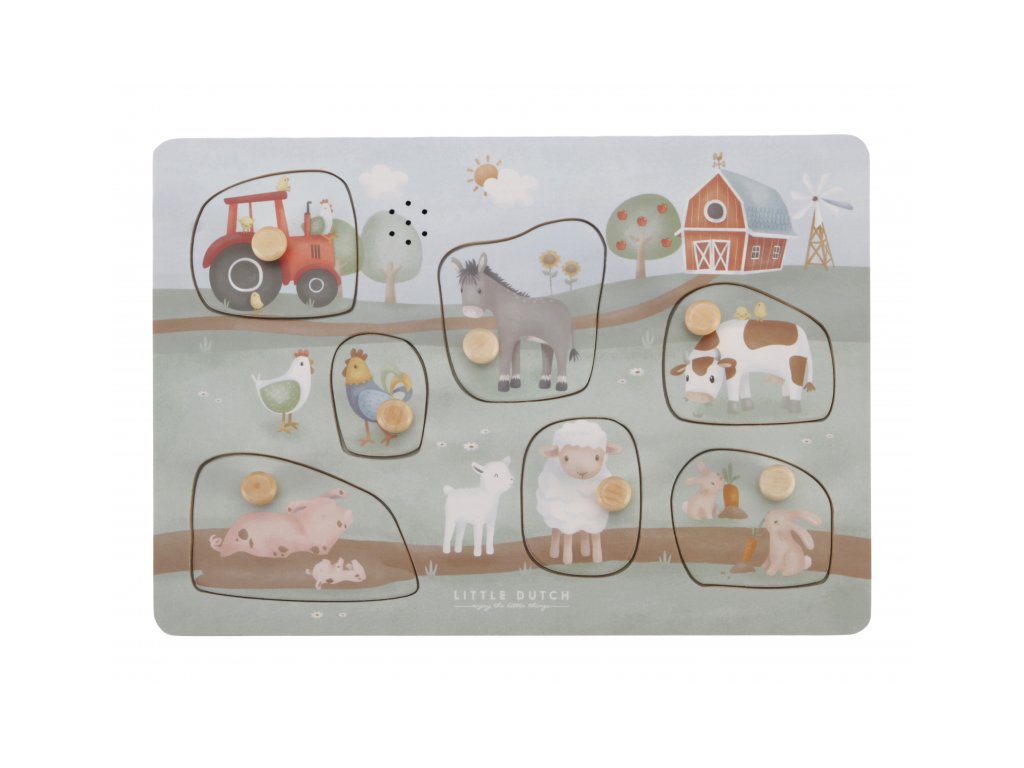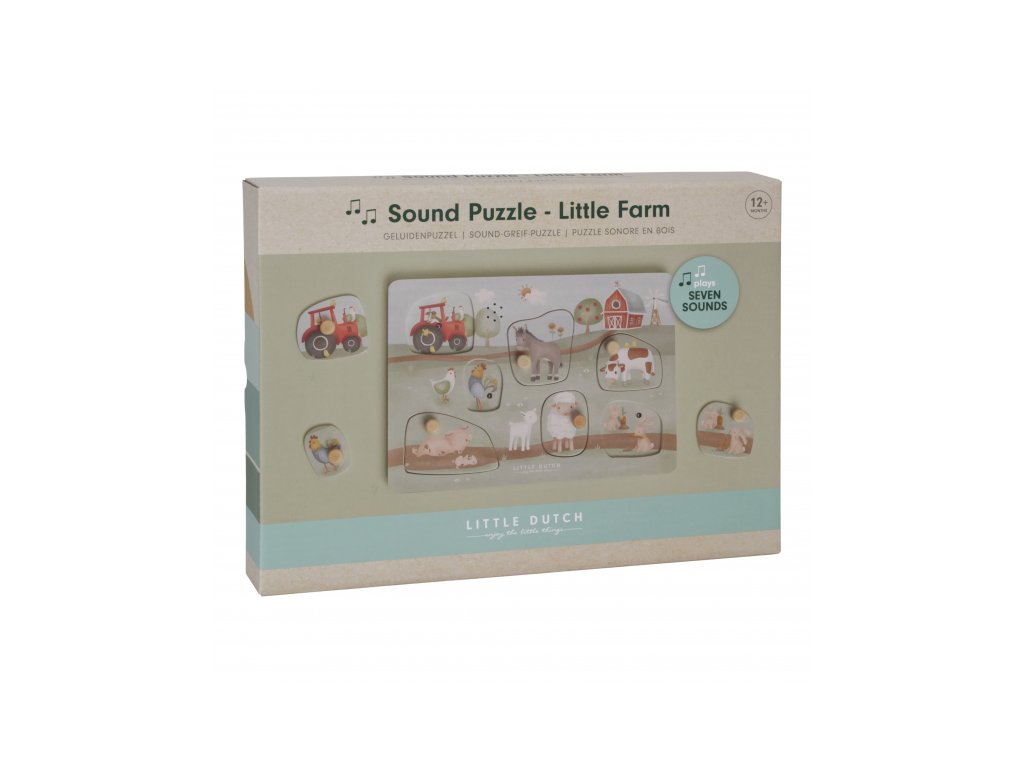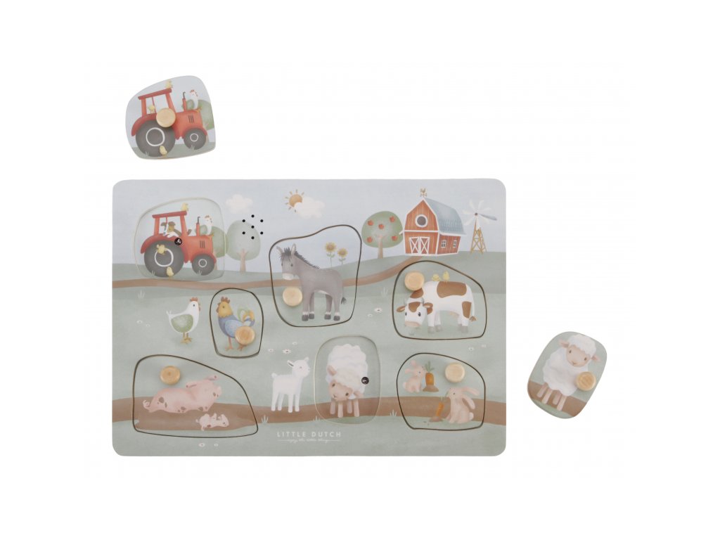 Puzzle hra v drevenom prevedení s krásnymi obrázkami ponúka 7 rôznych vkladacích dielov v tvare traktora a zvieratiek s ich hlasmi.
